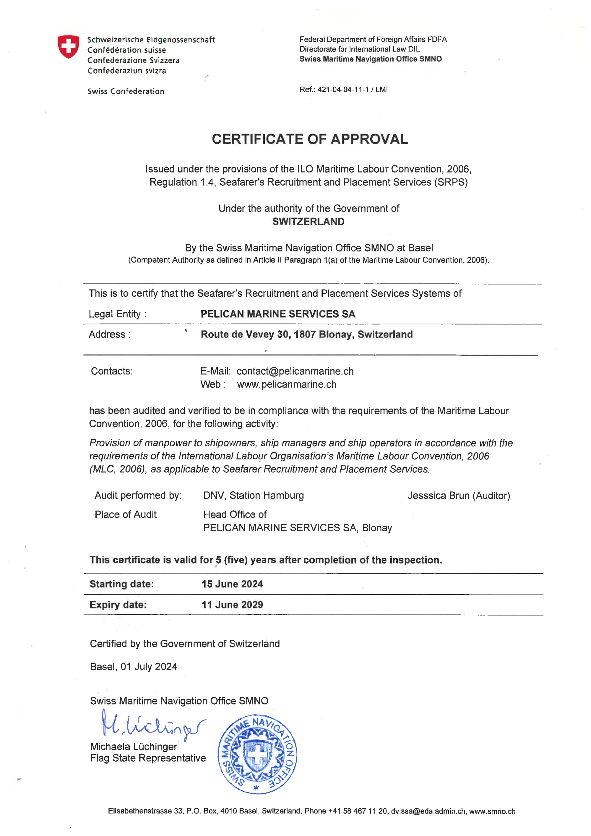 Since 2014, Pelican Marines Services is approved by Swiss Maritime Navigation Office (SMNO) in compliance with MLC 2006 requirements.